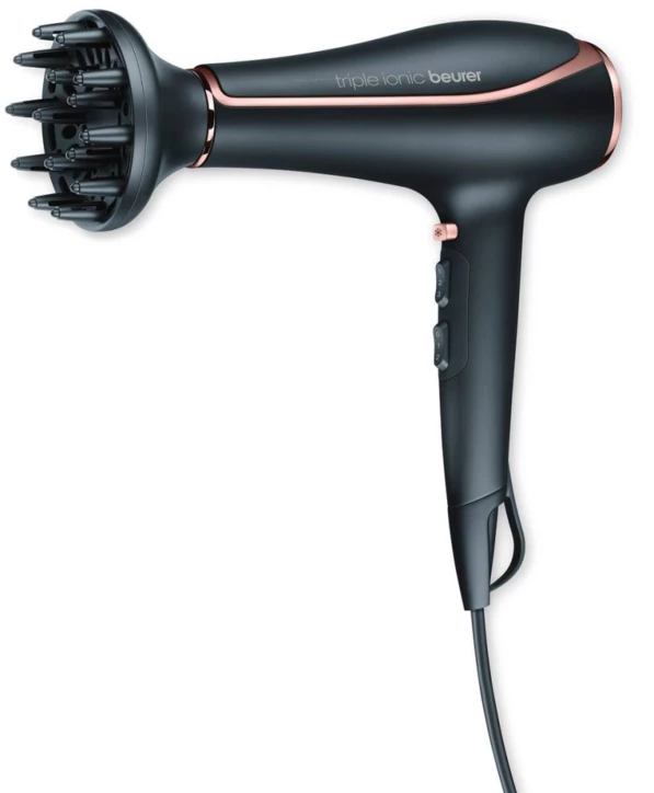Technologie ionique à 3 niveaux et position air froid. 3 niveaux de chaleur et 2 puissances de ventilation. Buse fine professionnelle et diffuseur de volume.